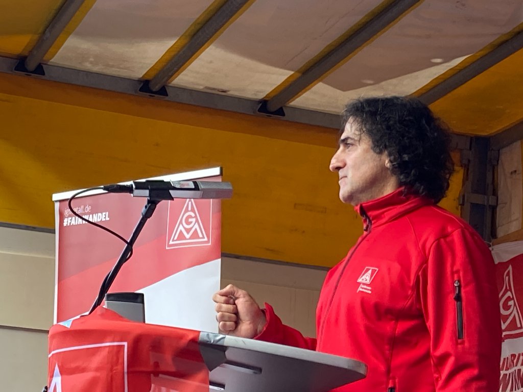 Michael Unser, Erster Bevollmächtigter der IG Metall Heilbronn-Neckarsulm, nannte das Angebot der Arbeitgeber unanständig und machte in seiner Rede die Bedeutung des unzureichenden Angebots der Arbeitgeber deutlich: "Wir stehen