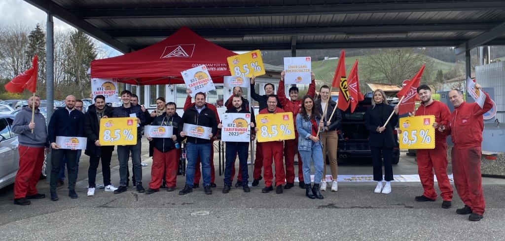 Neckarsulm. Anlässlich der 1. Tarifverhandlung im KFZ-Handwerk Baden-Württemberg, lud die IG Metall Geschäftsstelle Heilbronn-Neckarsulm heute am 27. März 2023, die Beschäftigten vom Autohaus ASW im Audizentrum