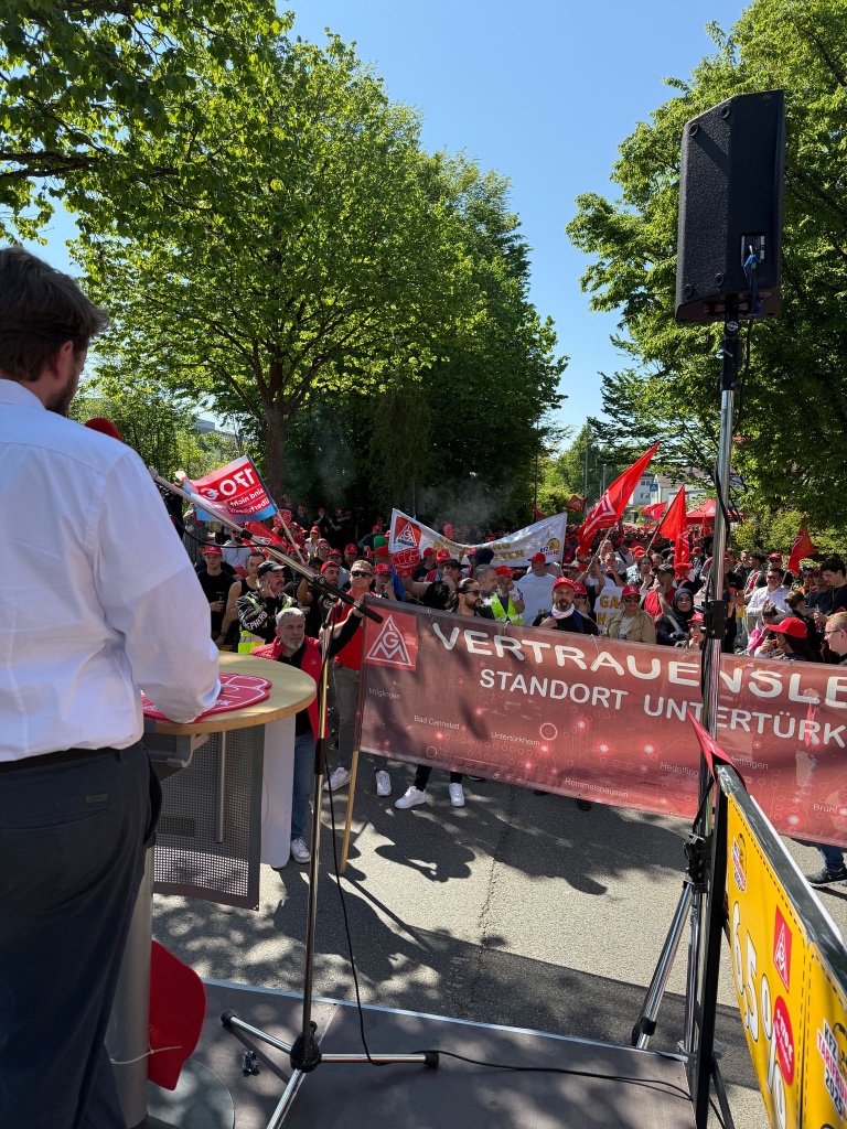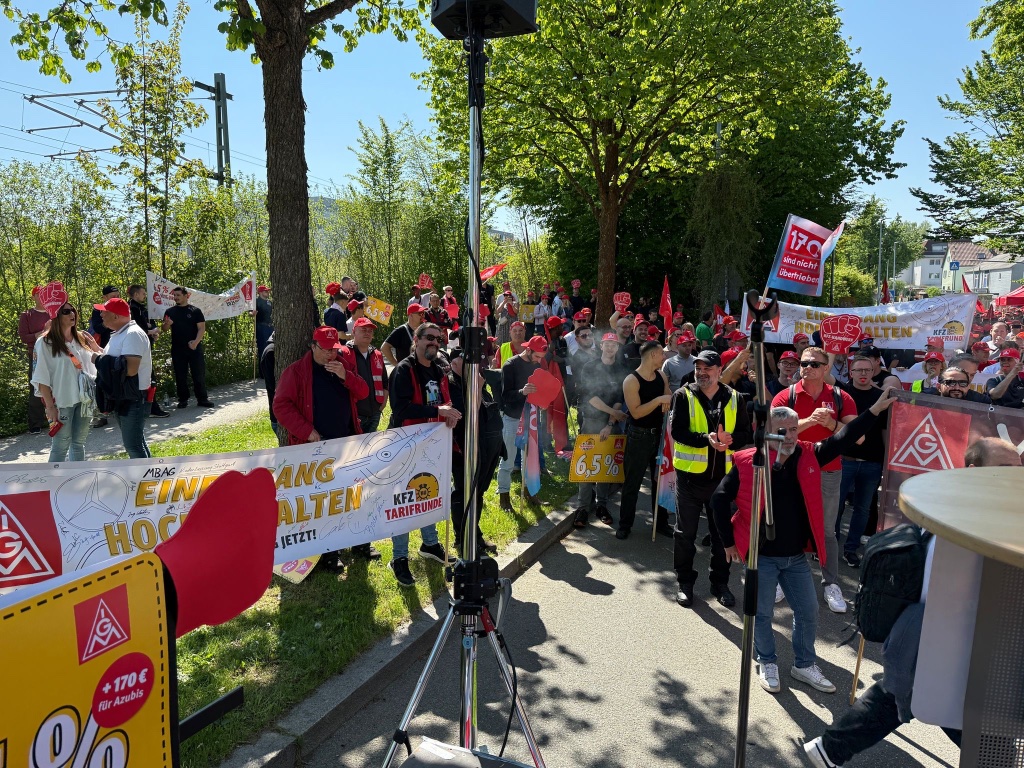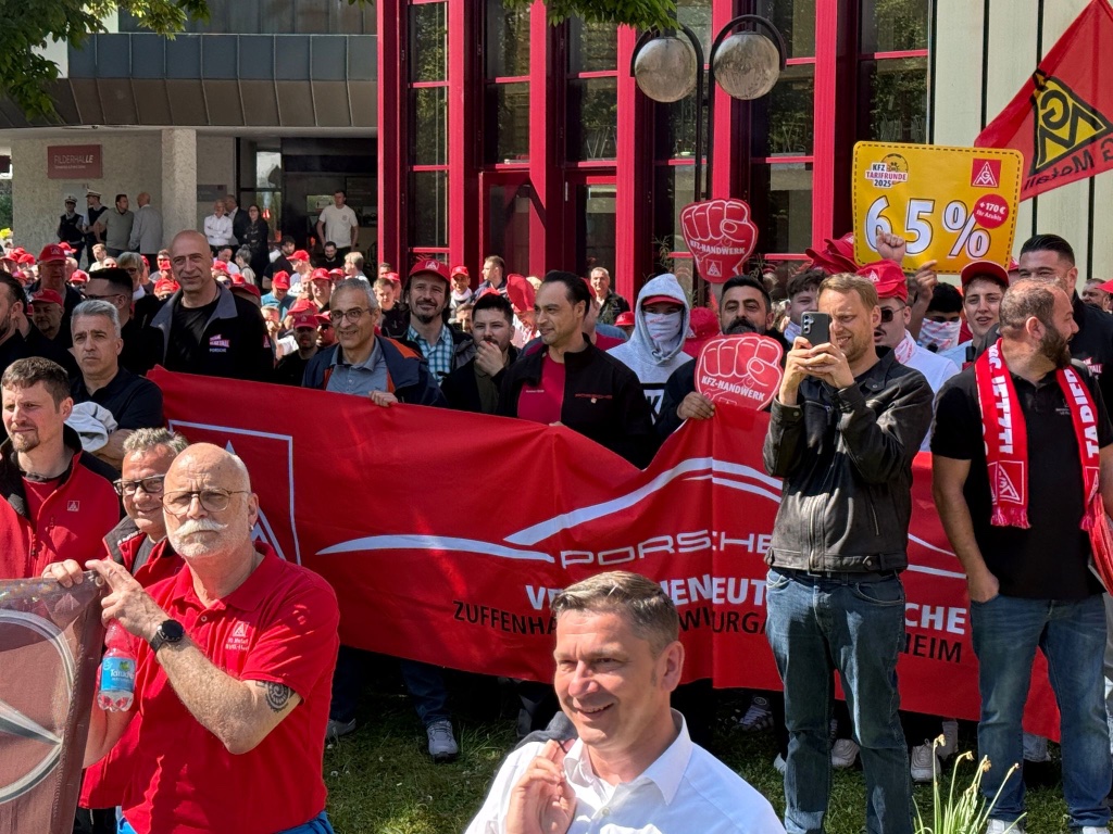Leinfelden-Echterdingen. Mit einer kraftvollen Aktion haben heute rund 1000 Beschäftigte aus dem Kfz-Handwerk in Baden-Württemberg während der zweiten Tarifverhandlung ein unübersehbares Signal an die Arbeitgeberseite gesendet: Die Forderung nach 6,5 Prozent mehr Entgelt, einer überproportionalen Erhöhung der Ausbildungsvergütungen um 170 Euro sowie einer deutlichen Entlastungskomponente ist mehr als nur gerechtfertigt und vor allem notwendig.