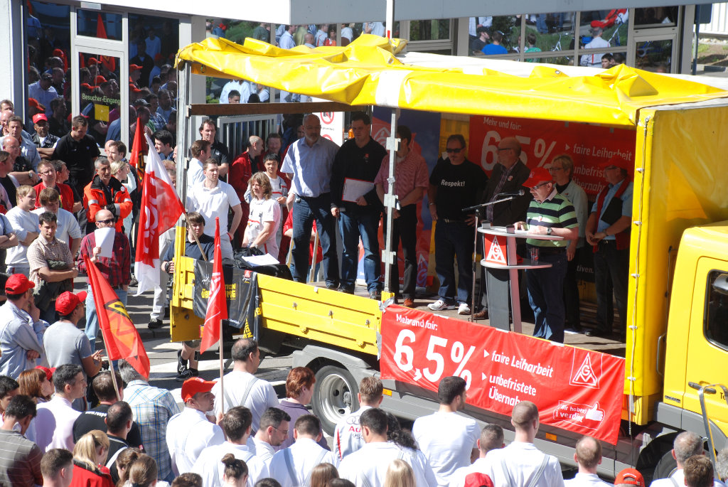 Jürgen Mews, Leiter des Vertrauenskörpers bei Audi betonte, dass eine Erfolgsbeteiligung eine Tariferhöhung nicht ersetzen kann: "Eine Tariferhöhung bleibt für die Beschäftigten auch dann spürbar, wenn der Unternehmenserfolg einmal ausbleibt." Gleichzeitig kritisierte Mews die hohe Zahl an Leiharbeitern in Deutschland: "Die Zahl der Leiharbeiter in diesem Land liegt bei über einer Million. Wir brauchen dringend mehr Mitbestimmungsrechte des Betriebsrats beim Thema Leiharbeit."