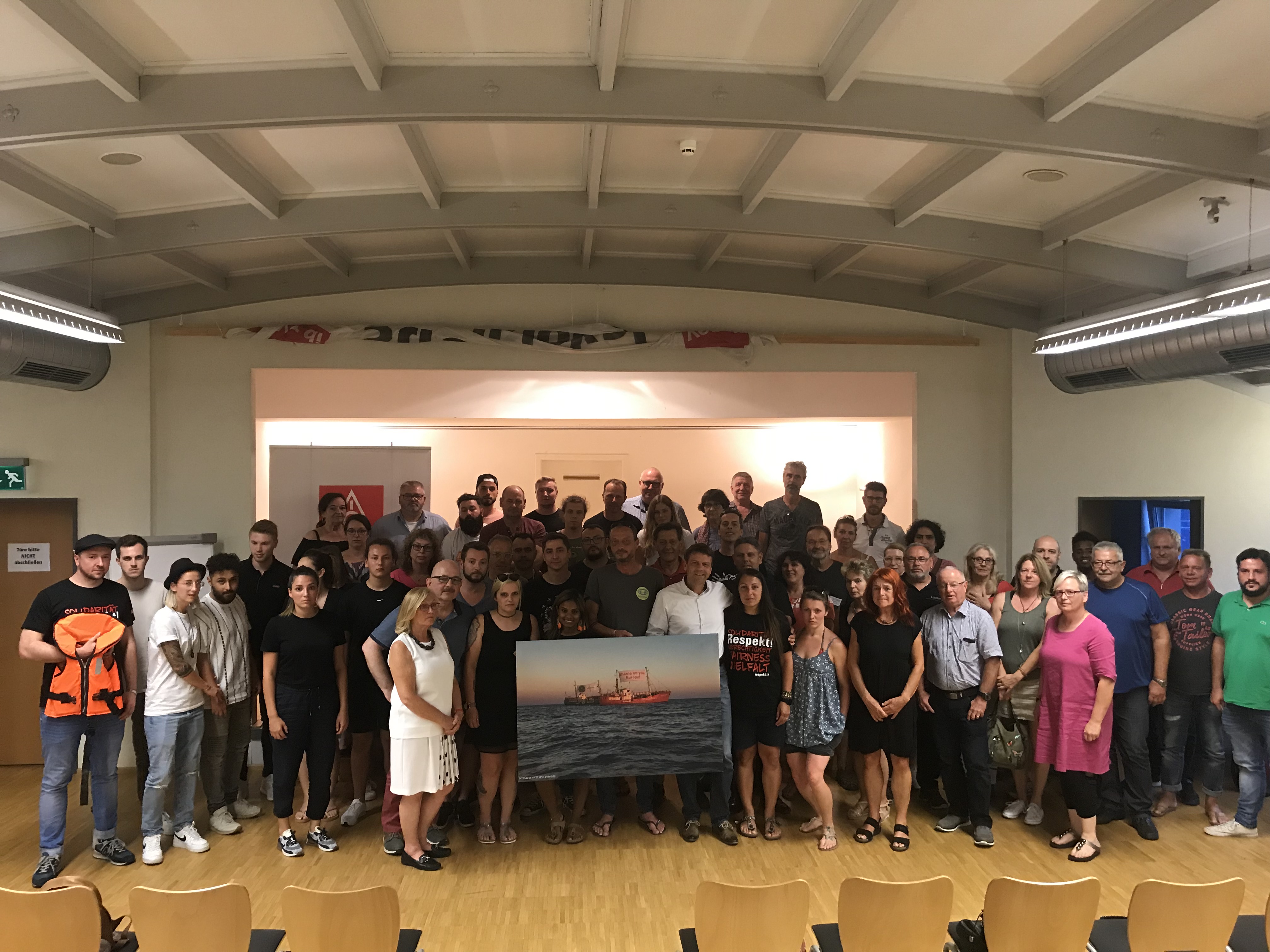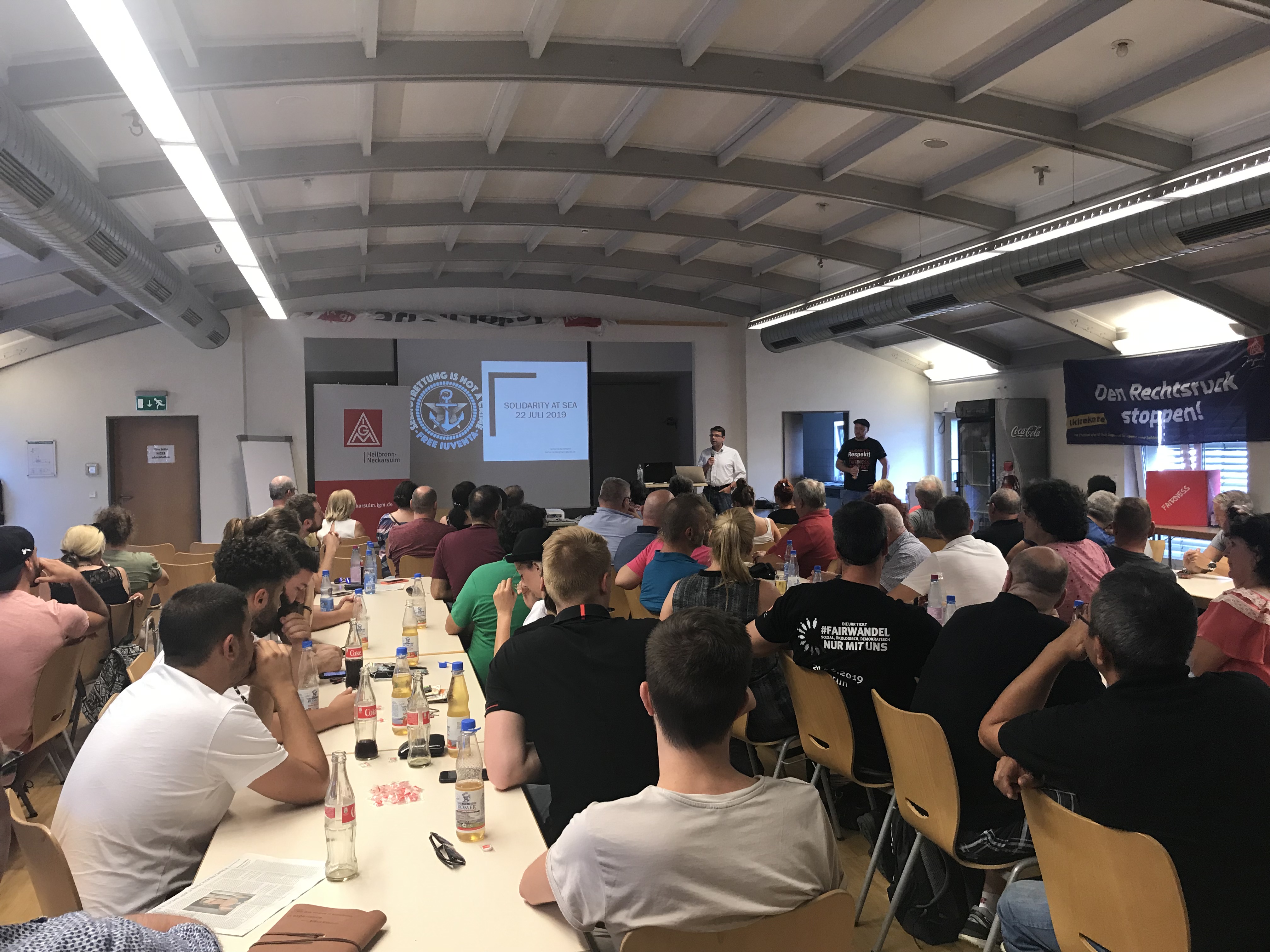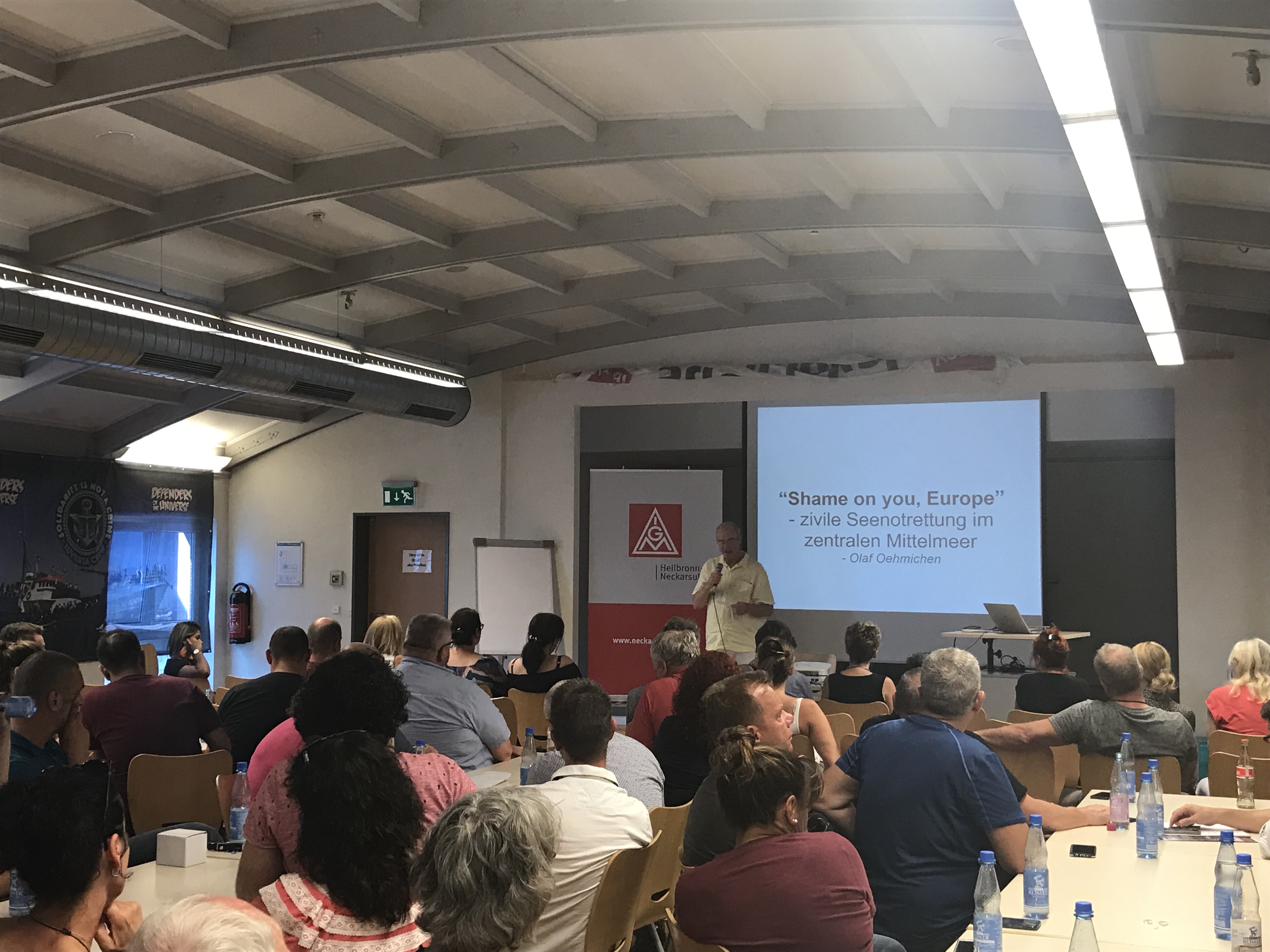 Am 22.07.2019 fand die Eröffnungsveranstaltung zur Fotoausstellung Angekommen/ Shame! von Thomas Bollmann der IG Metall Heilbronn-Neckarsulm im Heilbronner DGB Gewerkschaftshaus statt. Bei der Veranstaltung berichteten auch Vertreterinnen und Vertreter der "Solidarity at Sea" und der Seaeye Crew.