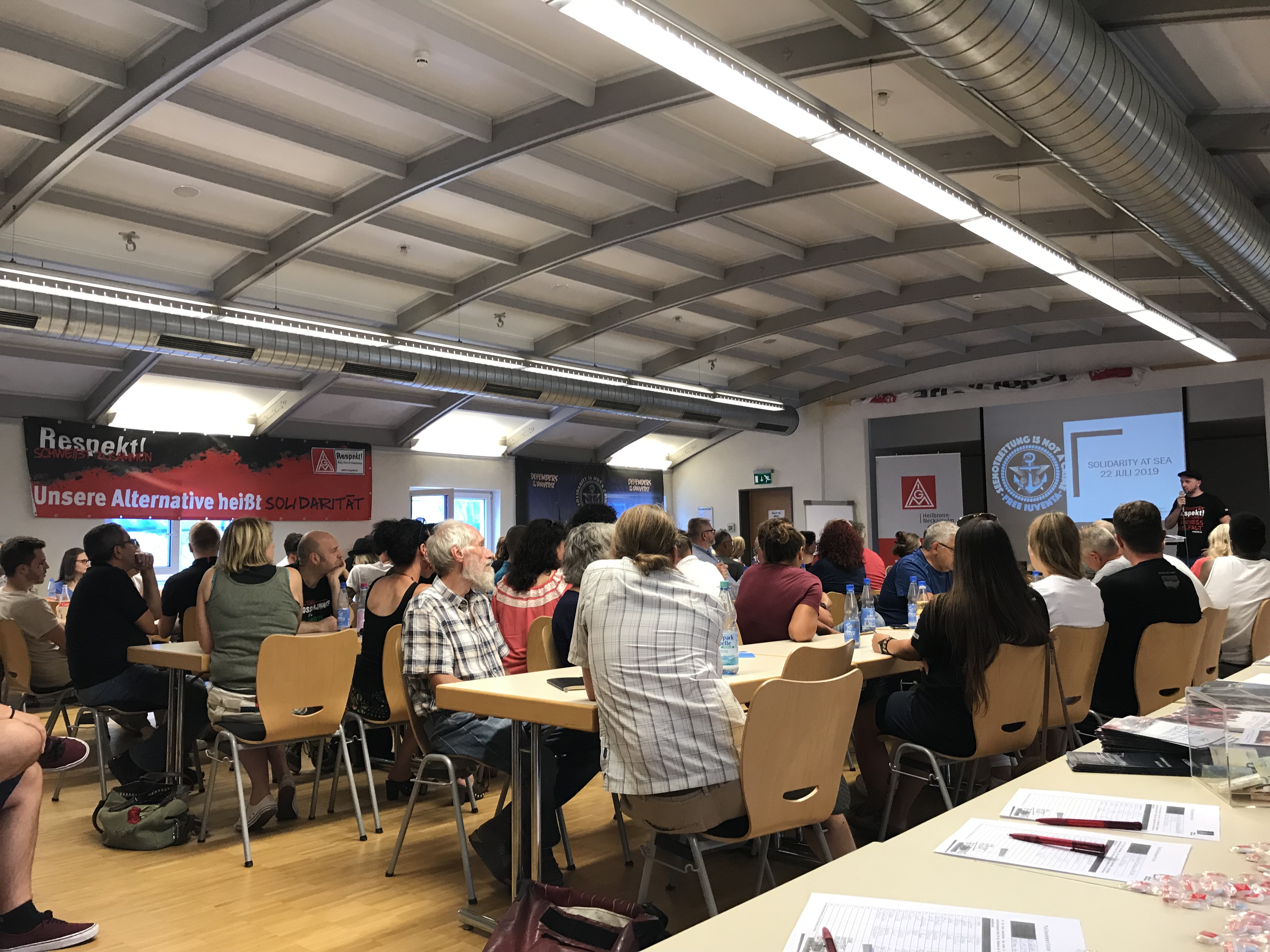 Die Menschen, die sich in der privaten Seenotrettung engagieren, machen das auf eigene Kosten und bringen dafür ihre regulären Urlaubstage ein. Alleine durch die eindrücklichen Bilder und Videoaufnahmen die er den Teilnehmern zeigt, wird schnell klar, welchen psychischen Belastungen die Helfer bei solchen Einsätzen ausgesetzt sind. Im Saal des DGB Hauses war es so still, dass man Sprichwörtlich die Stecknadel fallen hören konnte und ein Blick in die Gesichter sprach Bände über die Betroffenheit.