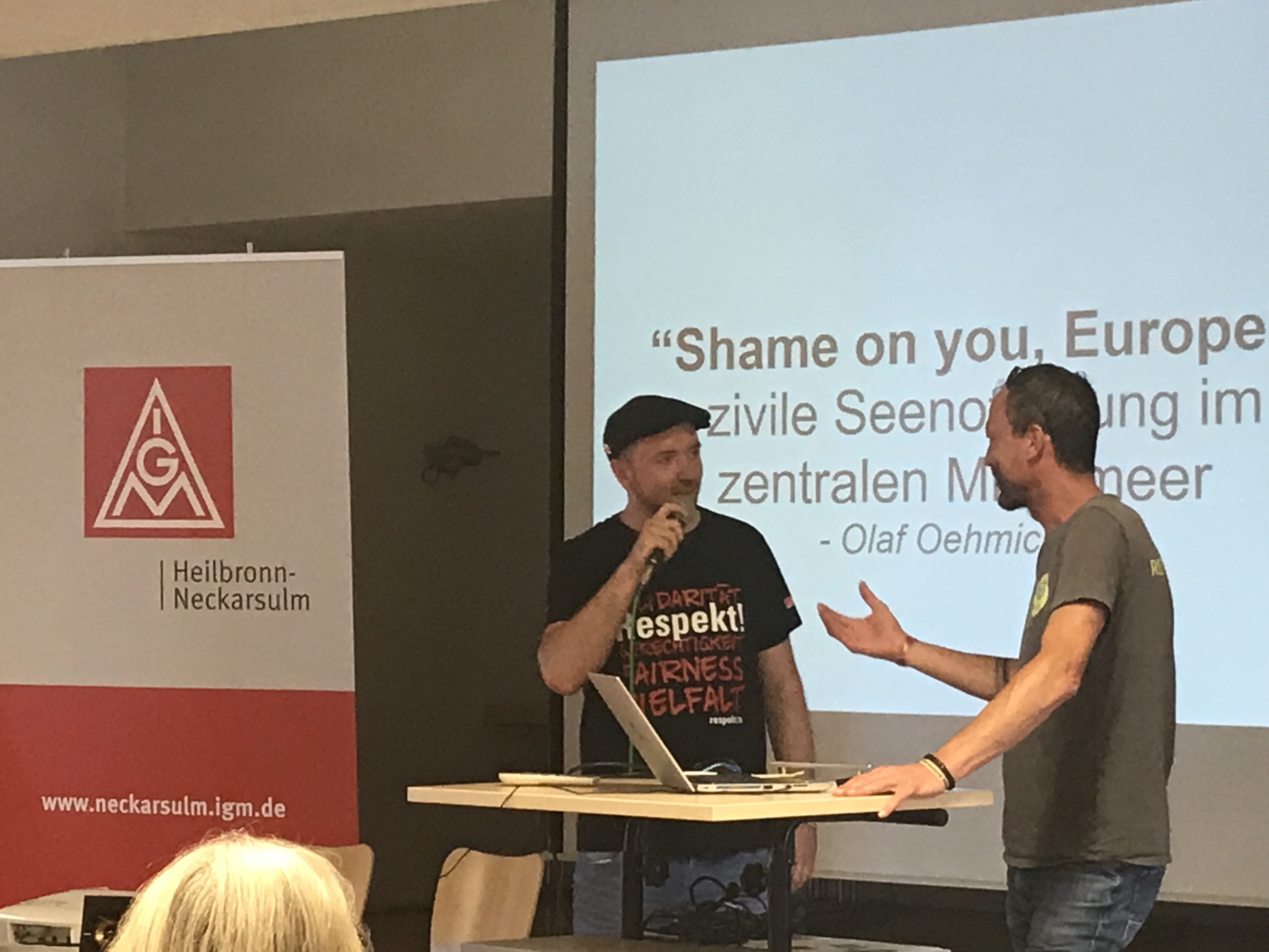 "Es ist beschämend zu sehen, welches Leid Menschen auf der Suche nach Sicherheit und einem besseren Leben aushalten müssen - wenn sie es überhaupt schaffen lebend europäisches Festland zu erreichen" spricht Michael Unser, Geschäftsführer der IG Metall Heilbronn-Neckarsulm. "Wir dürfen unsere Augen nicht verschließen was an Europas Außengrenzen tagtäglich passiert. Wir müssen unserer gesellschaftlichen Pflicht als größte unabhängige Gewerkschaft der Welt nachkommen und für dieses Thema sensibilisieren. Menschen zu retten ist kein Verbrechen! Respekt vor jedem Leben! So Michael Unser und Christian Agocs Gewerkschaftssekretär und Organisator der Veranstaltung.